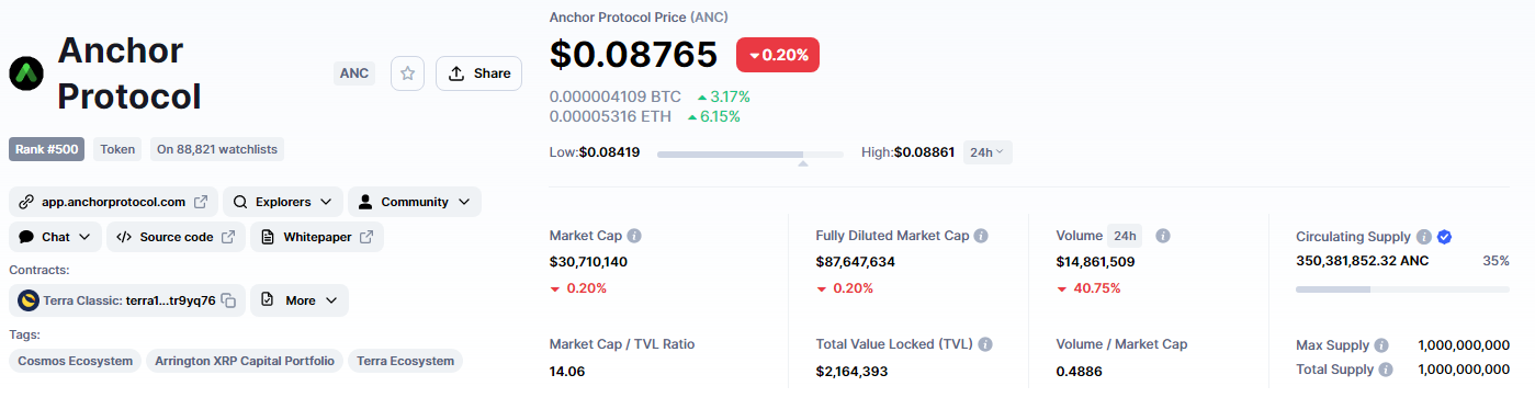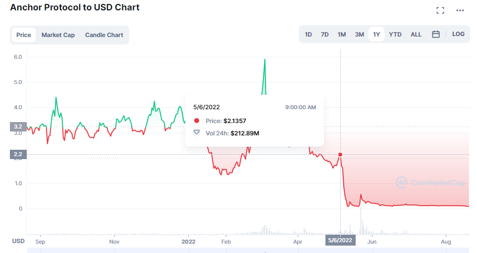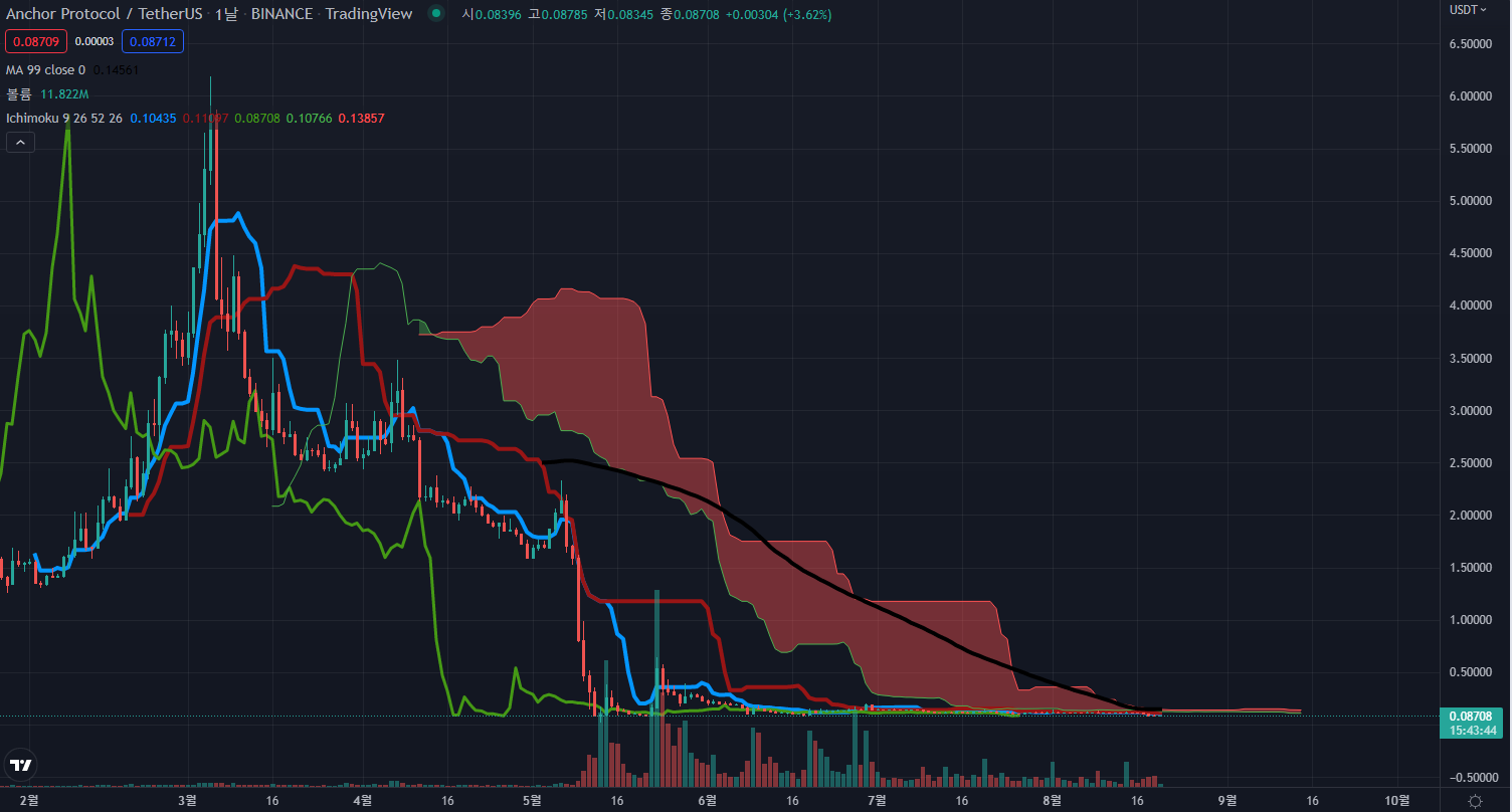 1~3$를 왔다갔다하며 나름 입지를 다지고 있었던 앵커 프로토콜 코인은 루나 사태를 기점으로 루나와 함께 회복 불가능해보이는 수렁 속으로 빠지게 됩니다. 다만 거의 몇십만 토막이 났던 루나에 비해 앵커 프로토콜은 그렇게까지 떨어지지는 않았는데요, 이는 거의 무한 발행에 가깝게 찍어내서 다시는 원래 가격으로 못 돌아갈 루나가 비정상적인 것이지 2달러부근에서 0.08달러까지 떨어진 앵커 프로토콜도 사실상 러그에 가까울 정도로 파멸한 건 마찬가지입니다.