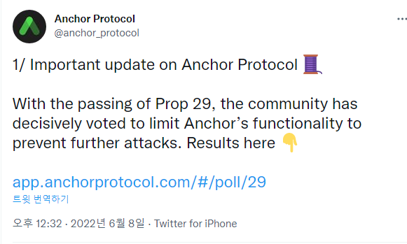 6월 8일 올라왔던 이 앵커 프로토콜 중지 트윗을 마지막으로 트위터도 더이상의 글 업데이트가 없는 상황입니다.