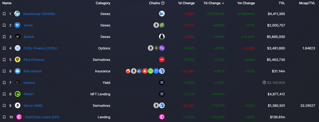아까 위에서 보았던 SX의 Sharkswap이 상승률 1위를 차지했네요. 다만 최근부터 잡히기 시작한거라 저런 말도 안되는 상승률이 잡힌 것 같습니다. 생긴 것도 그냥 파밍 기능이 딸려있는 유니스왑 포크입니다. 그럼에도 초창기부터 상당한 TVL로 치고올라오긴 했네요.