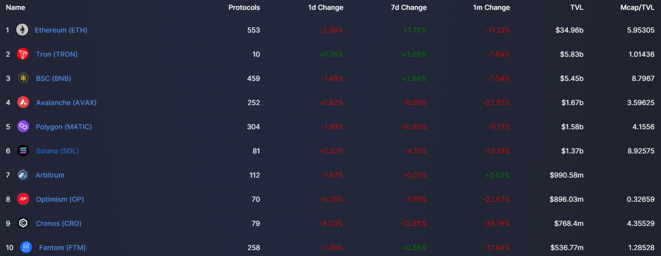 순위 자체는 저번주와 변동이 없습니다. 지난 일주일간 크게 튀어오른 체인은 없고 폴리곤이랑 크로노스가 조금 빠진 모습인데,
