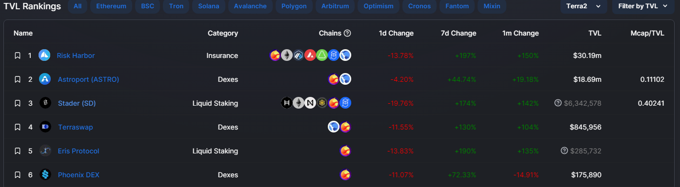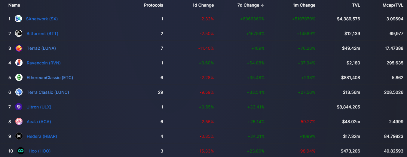 지난주에 이어 이번주는 루나2가 크게 튀어올랐습니다. 이외 POW코인인 레이븐과 ETC가 올랐는데, 레이븐은 원래 안 잡히다가 이번에 잡힌 거라 논외로 치고 (TVL도 상당히 낮습니다.) ETC는 꾸준히 상승하고 있는 것 같네요. 1, 2위인 SX와 비트토렌트의 TVL이 크지는 않아 이번주의 사실상 1위는 루나2가 된 것 같습니다..