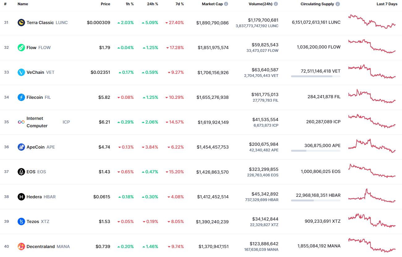 저번주에 혼자 갑자기 미친듯이 올랐던 루나 클래식은 조금 진정을 되찾고 서서히 내려가는 중입니다. 그외 31~40위권 코인 모두 내려앉았습니다. 메타버스 관련 코인 대결은 APE가 갑자기 치고 올라가서 36위권까지 올라갔습니다.
