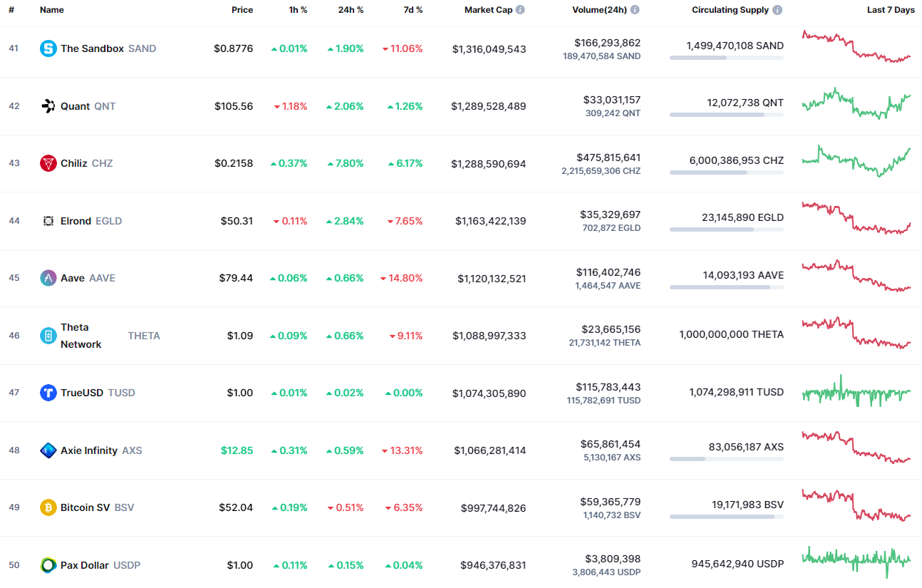 최근 엄청난 상승을 보여줬다가 조금 잠잠해졌던 칠리즈가 이번주에도 상승을 보여줬습니다. 아무래도 바이낸스에서 밀어주는 코인이다보니 조금 떨어졌다가도 계속 가격을 회복하는 것 같네요. 50위 권 내의 유일한 P2E 코인인 엑시는 시간이 지날수록 점점 순위가 떨어지고 있습니다..