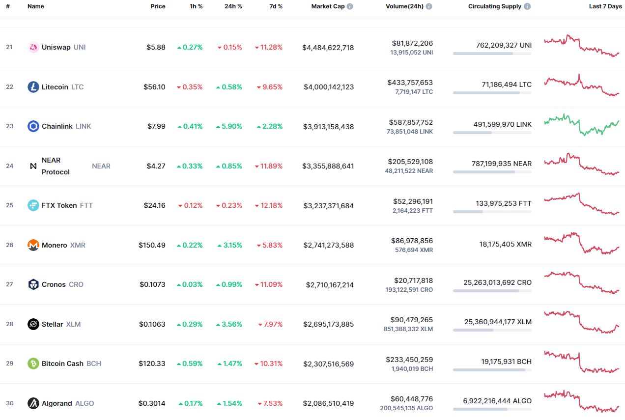 21~30위도 모두 저번주에 비해 많이 내려앉았습니다. 체인링크 혼자서 저번주에 비해 상승을 보여주었습니다. 체인링크는 저번주에도 상승을 꽤나 보여줬는데 이번주에도 이어서 나쁘지않은 모습을 꾸준히 보여주고 있습니다. 일단 오라클 계열 1위라는 점에서 독보적인 입지를 다져가고 있는듯 합니다.