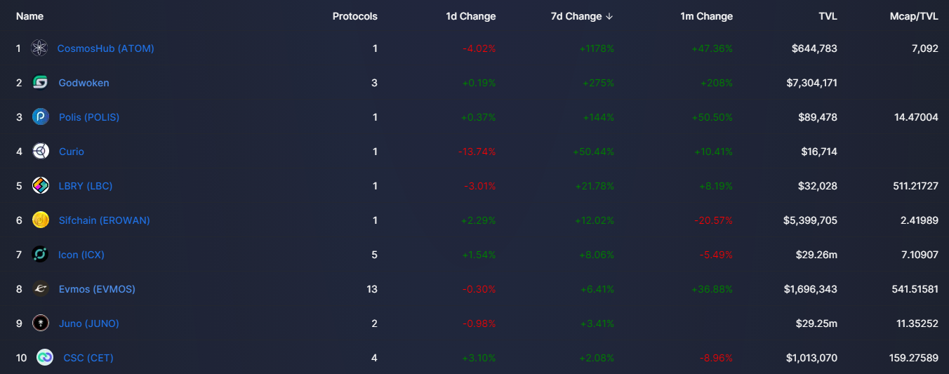 코스모스 계열 레이어는 많지만 코스모스(ATOM)이 체인에 직접 이름을 올린 적은 없었는데요, 코스모스는 그 자체로 블록체인이라기보다는 일종의 개발 킷이고 이를 사용한 레이어들이 루나, 쿠지라, osmos 등등 있었습니다. 이번에 1위에 올라간 Cosmoshub는 코스모스 계열이면서 메인토큰을 $atom으로 사용하는 본격적인 코스모스 체인입니다. 아직 TVL이 적어 크게 유의미하다고 보기엔 어렵지만, 계속해서 꾸준히 코스모스 계열 체인들이 곳곳에서 이름을 보이고 있네요. 당장 이번 상승률 순위 중에 Evmos나 Juno도 떠오르는 신생 코스모스 계열 체인입니다.