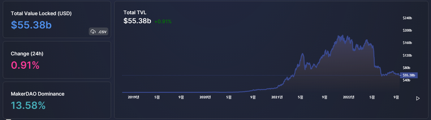 저번주보다 전체 TVL이 많이 빠진 모습입니다. 59.82b$에서 55.38b$로 30억 달러가 빠졌는데 이는