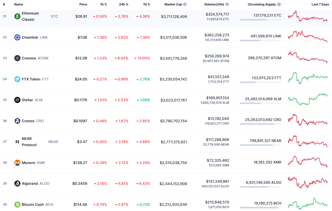 21~30위권에서는 코스모스가 이번주에도 큰 하락을 맞이했습니다. 전반적으로 최근 혼자서 조금 많이 올랐던 코인들이 뚜렷한 폭발적인 소식은 없다보니 비트코인 상황에 맞추어 다른 코인들과 맞춰나가는 모습입니다. 아무 소식 없던 코인들은 제자리고 최근 올랐던 코인 ETC, LINK, ALGO 등이 전반적으로 제자리로 돌아가는 것 같네요.